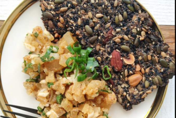 Jakákoliv semínka, oříšky, cokoliv potřebujete zpracovat (ale vždy musí být chia) si smícháme s kořením v misce a zalijeme vodou, zhruba jeden centimetr nad směs a necháme cca hodinu nabobtnat.