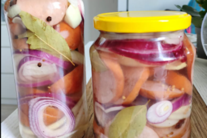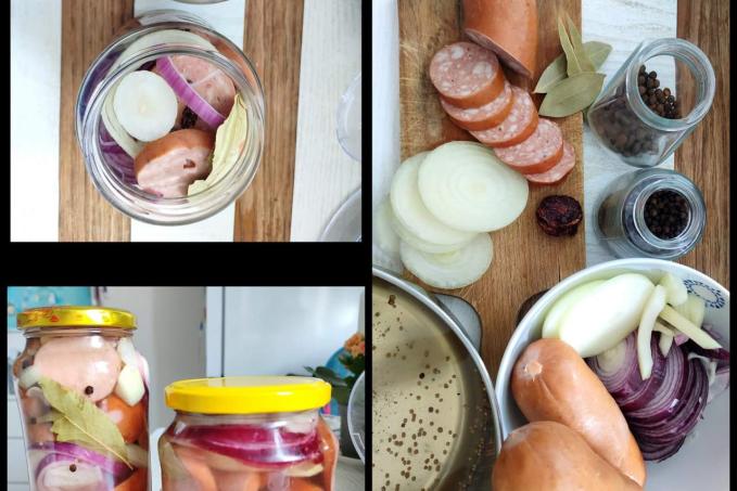 Pak už jen do skleničky prokládáme špekáčky a cibuli, mezi to koření a chilli. Zalijeme vlažným nálevem a necháme pár dní uležet.
