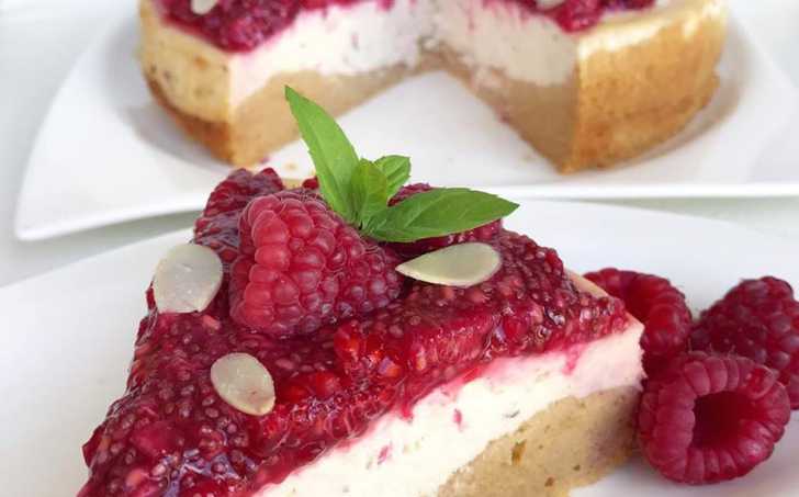 Maliny rozmačkej, přidej citronovou šťávu, sladidlo, trochu vody a nakonec chia semínka. Nech nabobtnat a poté tím ozdob dortík. Můžeš přidat celé maliny, mandle a mátu na ozdobu.