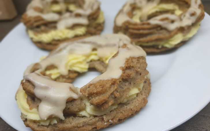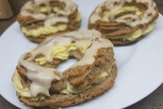 Odpalované těsto: vodu s máslem ohřát v hrnci, vsypat ostatní smíchané suroviny kromě vajec. A míchat a míchat, dokud se odpařováním vody vypracuje těsto, které bude hladké a nebude lepit, bude držet pohromadě (i když v této verzi to není stejné jako s klasickou moukou). Těsto prostě po nabrání vařečkou musí být hladké a držet tvar hroudy. Chvilku to trvá. Poté se těsto nechá vychladit, stačí aby bylo vlažné a zapracují se vejce jedno po druhém. Těsto je hladké, ale dostatečně tuhé, aby po nastříkání na plech drželo tvar. Pekl jsem 25 minut na 180 °C. Po vychladnutí rozpůlil a naplnil.