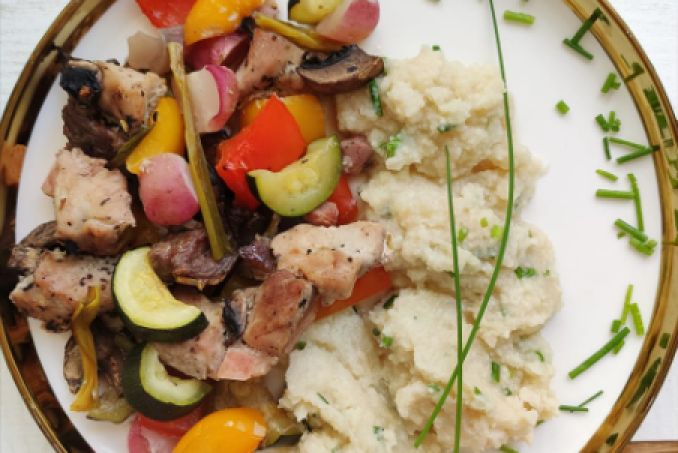 Nakrájené maso a zeleninu osolíme a opepříme, rozložíme na pekáč, lehce podlijeme vodou, přikryjeme alobalem a pečeme na 180 stupňů alespoň hodinu. Pak odkryjeme a pečeme cca 10 minut dozlatova.