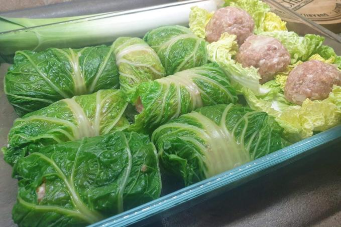 Mezitím nastrouhat najemno cibuli, nahrubo mozzarellu, smíchat s masem a vejcem, podle chuti přidat koření, sůl a pepř. List zelí položit na rovnou plochu, v dlani vytvořit z masa váleček a zavinout do listu od silnější strany. Vložit do pekáčku, zbytek malých listů jsem jen pokladl vedle a ze zbytku masa udělal ještě koule a pekl na nich.