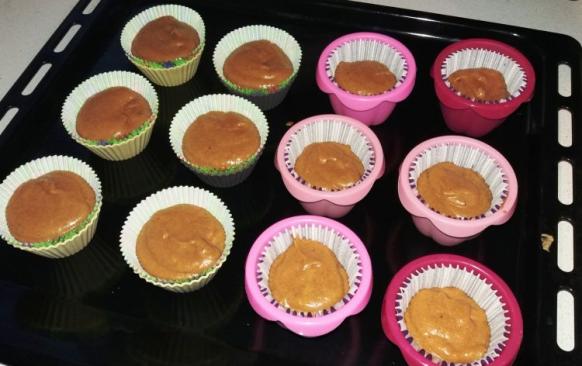 Rozpuštěnou heru šlehejte s cukrem (i vanilkovým), po chvíli přidejte vejce, pyré, skořici, kůru a nakonec přimíchejte úprosátou mouku s kakaem a práškem do pečiva. (Pokud by se vám těsto zdálo díky kakau hustší, přicvrkněte trošku mléka.) Naplňte muffinové košíčky do poloviny, položte do nich kousek čokolády a doplňte těstem do 3/4 košíčků.