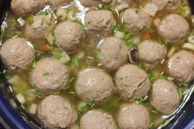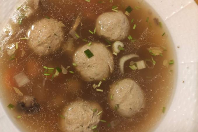 Knedlíčky: v blenderu jsem rozmixovala kuřecí prso se syrovými kachními játry, celerovými lístky, mletým barevným pepřem, česnekem, špetkou chilli vloček, solí a lžičkou sójové omáčky. Mokrýma rukama jsem udělala malé knedlíčky a uvařila ve vývaru se zeleninou.