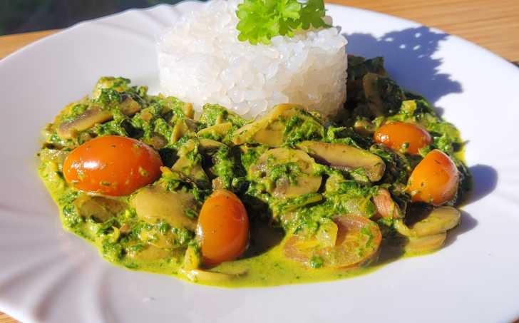 Na jemně nakrájené slanině osmažím cibulku, přidám česnek a na plátky nakrájené žampiony, posypu drceným kmínem a chvíli restuji. Vložím špenát, rajčátka, posypu kari, kurkumou, osolím, opepřím, zaliji šlehačkou a nechám krátce povařit.