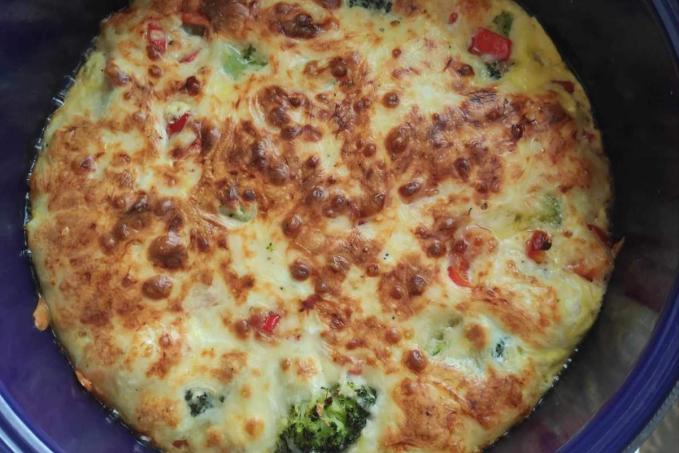 V misce rozšleháme 4 vejce, hrnek mléka, sůl a pepř, 10 dkg strouhaného sýru (eidam, mozzarella) a nalijeme na brokolici. Pečeme asi 30 minut na 180°C.