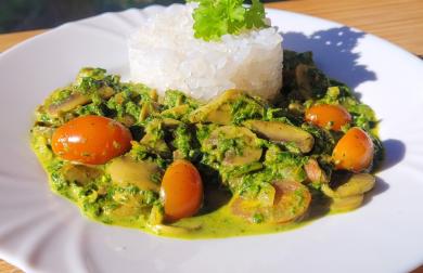 Do woku dejte olej, cibuli mírně osmahněte a přidejte ostatní zeleninu, Opékejte asi 10 minut a přidejte koření. Velmi krátce osmahněte, aby koření nezhořklo, a zalijte vodou (nebo zeleninovým vývarem) a kokosovým mlékem. Osolte, opepřete a přidejte propláchnutou cizrnu.