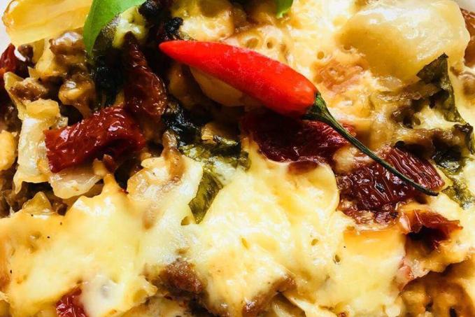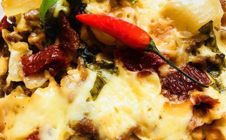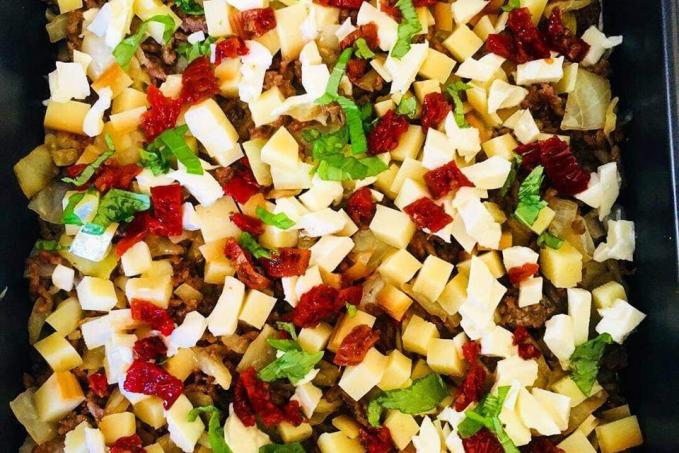 Chvíli spolu podusit, pak dát do pekáčku, zalít smetanou, na to jsem dala 3 druhy sýrů (eidam, uzený eidam, mozzarellu), sušená rajčata a bazalku.