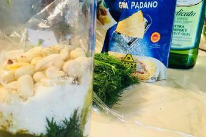 Pesto: hrst čerstvého kopru, 3 stroužky česneku, Grana Padano nebo Parmezán, piniové oříšky, nebo klidně nesolené arašídy, sůl, pepř, olivový olej, vše rozmixovat.